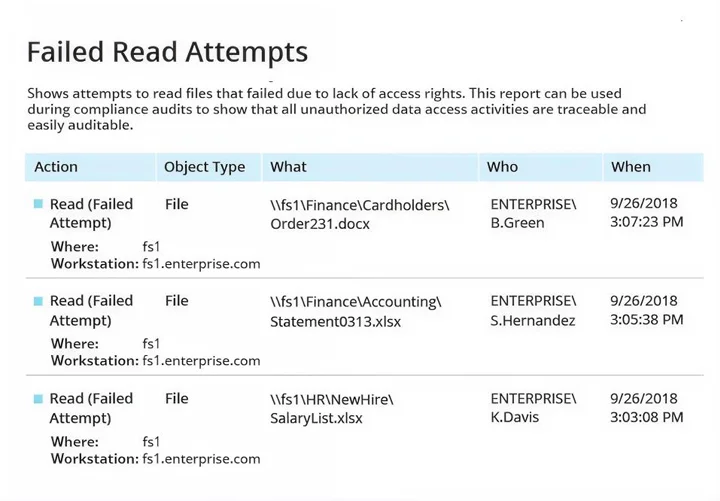 - Detailed reports on successful and failed read attempts to identify unauthorized access.