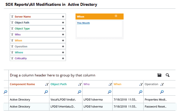 LepideAuditor for Active Directory audits every aspect of Active Directory. Every change made in the Active Directory environment is monitored, recorded, and presented in minute detail. Before-and-after-values of every configuration change are provided in a readable format. The answers to the coveted W’s of auditing (Who made What change, When, and Where) are just a few clicks away.