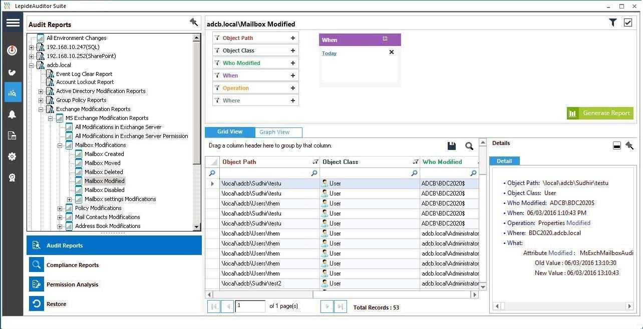 Exchange Server permission analysis displays historical changes in the permissions of Exchange objects. The administrator can compare the permissions for selected objects between two date and time intervals. You can save separate reports of both “Permission History” and “Compare Permission” in PDF, MHT or CSV formats on the disk.Read more